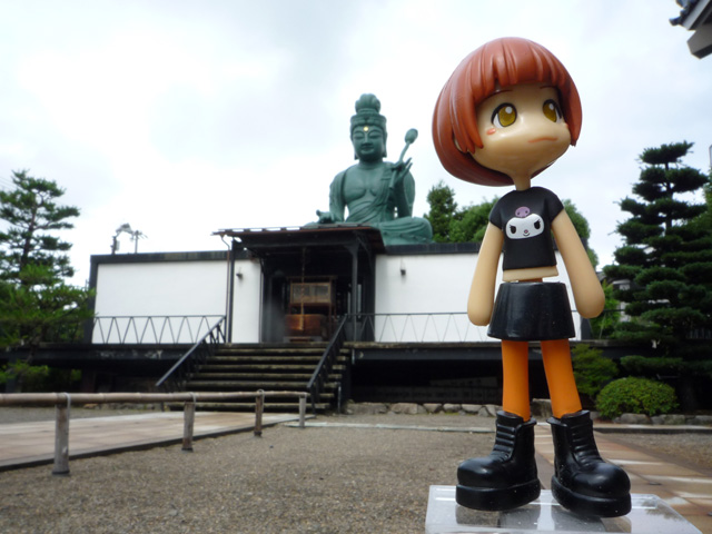 ここは北の庄城址。福井城の前にあったお城の跡なんだよ この場所は城門か本丸だかの跡みたいだけど 福井城と北の庄の遺構がぐちゃぐちゃ入り組んで大変だから 詳しいことはその辺の案内板で確認してね そして北の庄からぐるーっと街中を一回り 結構はなれたところの福井大仏 「でも、大仏というより小仏ってkなんじだよね。昨日の越前大仏の印象が強すぎるんだ