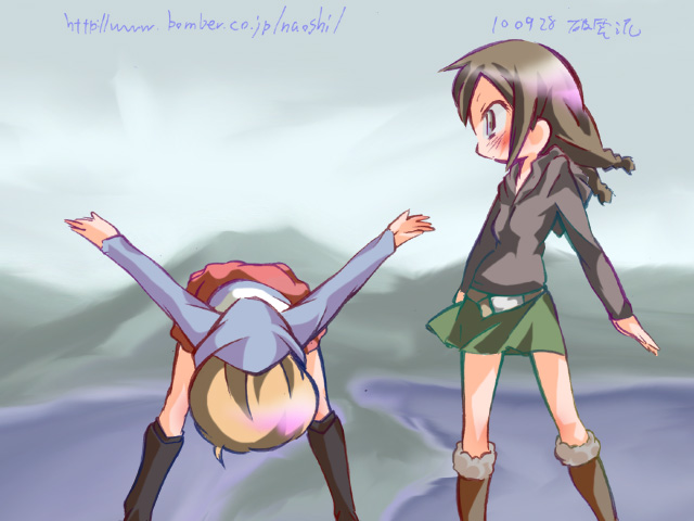 二人のイメージはよく写真とかで見るあのアングル そうだ下から解らないなら上から見ればいいんだ ちょうどすぐ近くに展望台があるわけだし ちょっと雨模様だけど今はそんなに雲かぶってないしね ほらちゃんと向こうまで一応見えるんだ