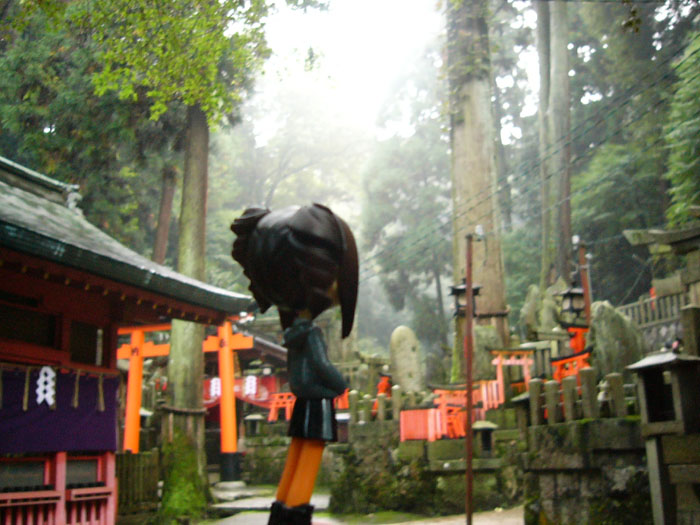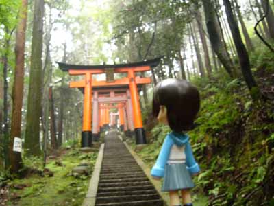 いつ果てることなく続く鳥居のトンネルに距離も時間も見失って 今自分が何処に居るのかもよく解んなくなってきてしまいました。 でも、ここを上りきればすぐ頂上です。がんばれ 「頂上に到着〜!!」 「頂上だけど回りの景色が何も見えないねぇ」 「あっ…御賽銭用の小銭が…っ」 行く先々で調子に乗って御賽銭あげまくるから でもそのおかげか雨が上がってきましたね。
