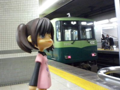 「せっかくすいていて座れたのになあ…」 ここは出柳町。不満そうなのは改札から遠い車両にいたんだもん あるいてるうちに比叡電鉄が込んじゃうよ