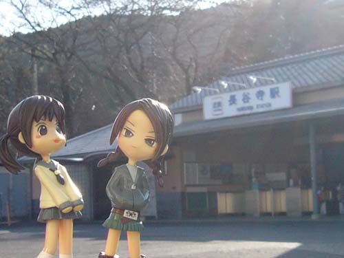 そんなわけであけて二日目、朝一番の新大宮。 「うっ…わーさむーい。温暖化はどこ行っちゃったのさー」 昨日から急激に冷え込んで、三月なのに一月のような冷え込みです あんまりにも寒いから使い捨てカイロが欲しいところだけど 今年はもう、仕入れてないんだって。コンビニの癖に便利じゃないったらもう だけど、そんな寒々しい朝なのに なんだかスゥは一寸楽しそう「いやね、4年ほど前に線路跨いだあそこのホテルに泊まったんだよね」 そう、スゥは数年前にも新大宮に泊まっていたのです しかも今日行くところは、その時に行った室生大野口の一寸手前 長谷寺だってんだから一寸因縁めいたものを感じちゃう 朝一の学生だらけな電車に乗って 近鉄長谷寺駅に到着したのでした ピンキーストーリー 〜・おでかけ おでかけ・〜 京都奈良滋賀2007・・・その二 pinkyってなんじゃ食物か?…って人は こちら そんなわけで近鉄長谷寺 一緒に降りてきた学生の集団が立ち去るのを見送って 彼らとは違う方向へと標識に沿って進みます