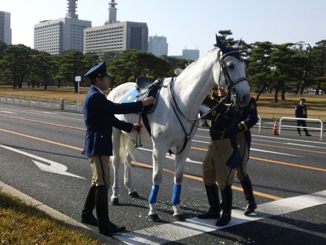 警察騎馬隊の馬を見るのが毎回の楽しみの一つですが こんかいは交代の時間に当たりました。貴重貴重 そして参賀