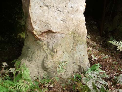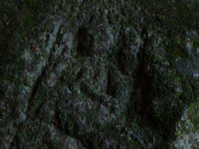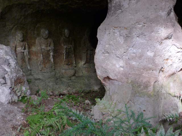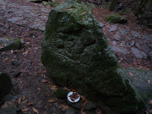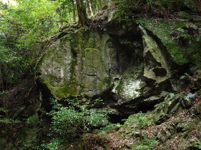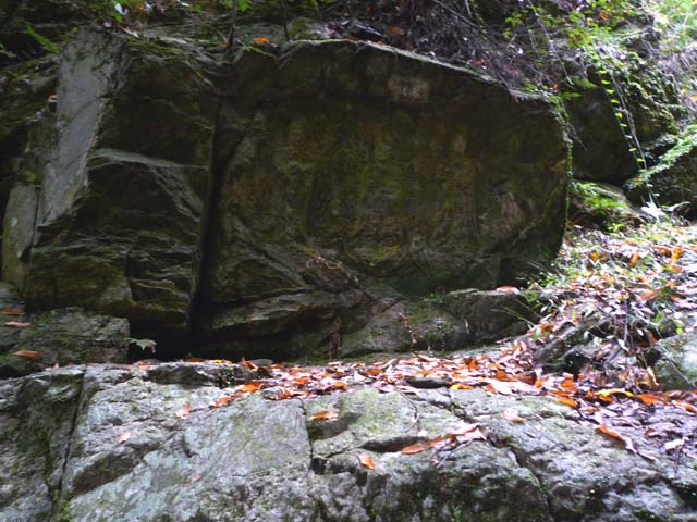 そういうわけでずんずん石畳の遊歩道を登っていくと 最初の目的地「寝仏」に到着です 何で寝仏かって三尊仏が彫られた岩が横に90度倒れているから