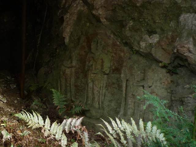 さて、春日山石窟物から今度は地獄谷石窟を目指します 地獄谷方面は遊歩道がないので奈良奥山ドライブウェーをぶらぶら いやあ、舗装された道路って歩きやすいなあ!! 車はたまにバスが通るぐらいだから向こうからよけてくれるしさ 春日山石窟から歩くこと1キロちょっと 地獄谷の入り口にあたる駐車場から道標に従い再び遊歩道で 山の中に入りそのまま突き進むと、谷を渡った先の岩穴に 彩色された三尊仏がありました
