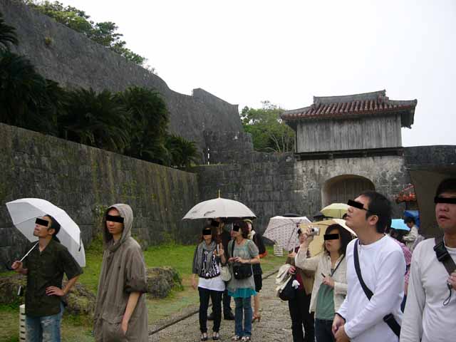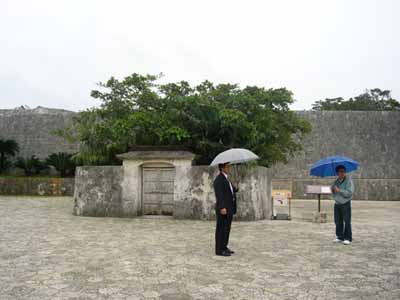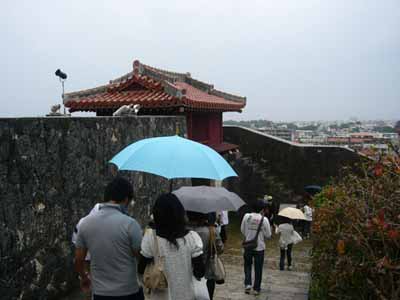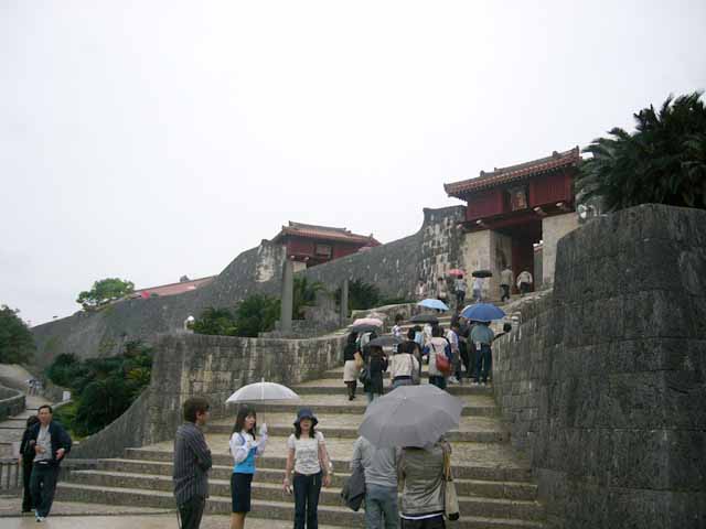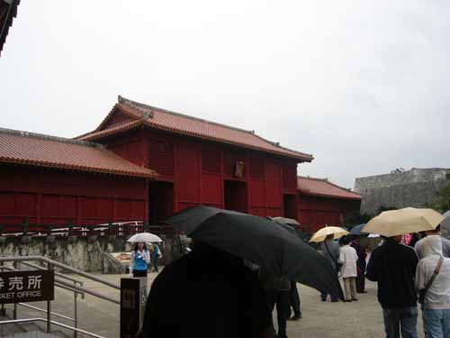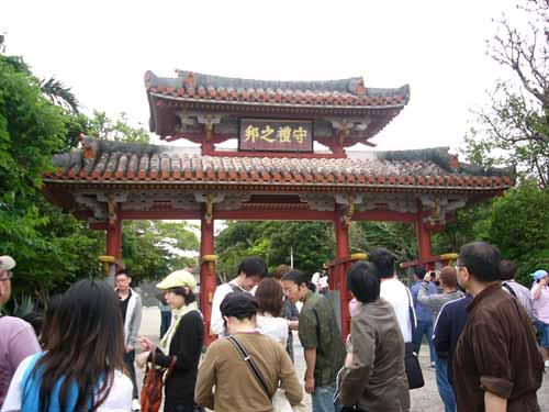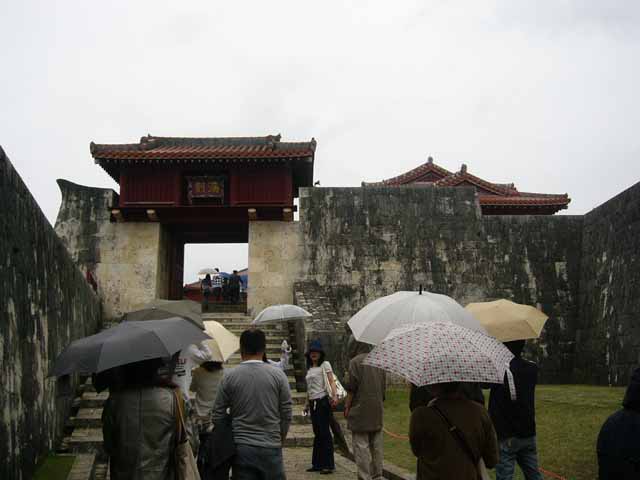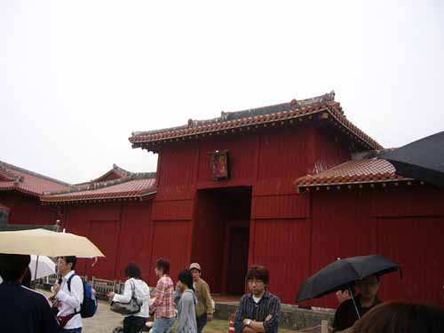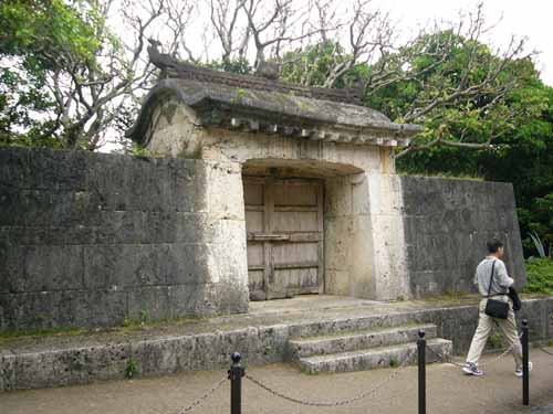 那覇でナハナハ笑う沖縄日記2008(三) pinkyなくちゃいやジャー!!…って人はこちら そんなわけであっという間の最終日 もう最終日かいーって感じではありますが なんか朝から小雨が降っています ええ、いつもどうり雨です 某MKK3000氏にして「なんか呪われてるんじゃないの?!君」 とかいわれてしまう僕ですが、今回も呪い大全開です まあ、雨といっても傘もイランぐらいの小雨なのが救いっちゃあ救いですが そんなわけで朝飯を食べたら一路バスで首里城へ 見学時間が短いしどうせ正殿のあたりしか見れないだろうってことで、 初日ライトアップ見に着た僕たち超勝ち組!!という訳で夜中ゆっくり見学した守礼門を潜り抜け あの時は閉まっていた歓迎門を目指します ところで守礼門のすぐ脇にあるこちら 園比屋武御獄石門