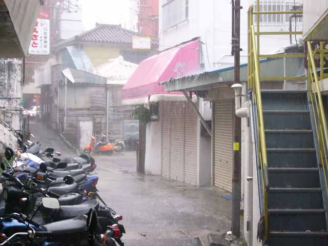 雨の中外うろつくのも面倒なので 市場本通り内でお土産買おうと 10人ぐらいであっちウロウロこっちウロウロ ヤギ専門店で飲んだ"まさひろ"の小瓶を売ってるのを発見したので お土産用に一箱一個ゲット!! 本当はかりゆしウェアか変な沖縄Tシャツも買おうと思ってたんですが 一寸いいのが見つけられなくて〜 …しかし、アーケードを叩く雨音が段々でかくなってきてるような…