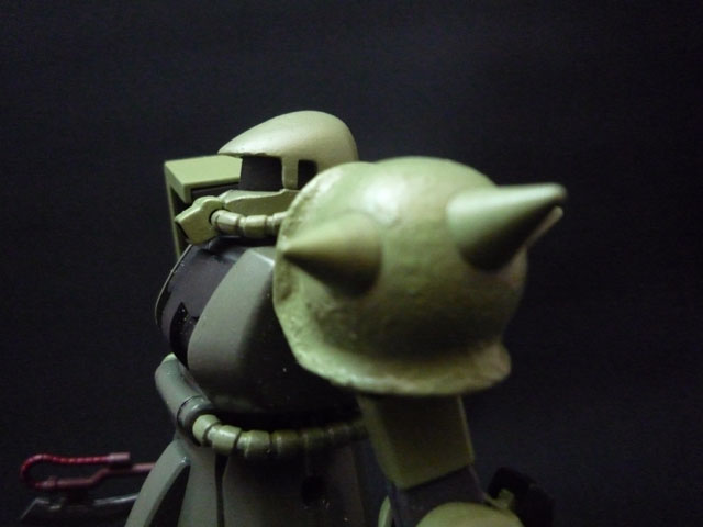 0900618 頭部は接合面に薄いプラ版をかましてさらに頭頂部にパテをもって鋭角的に削り込んでいます TV版の設定画や当時の大河原氏のイラストを見るとかなり頭が高くてとんがっているんですよ 庇も上に向かって削り込んで広げてあります。 本当はサイドの格子の位置も前へずらしたかったのですが 面倒くさそうだからそこは諦めました