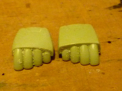 0900618 キットの手首はアニメを意識したごつくて丸い形状でカッコイイのですが 甲の形状が四角すぎてよくないと思います 作例では小指に向かって削り込んでおきました