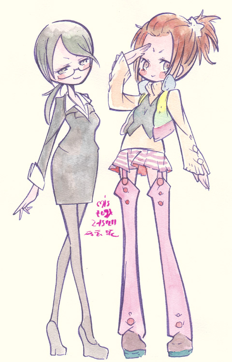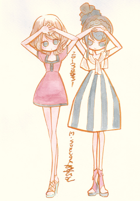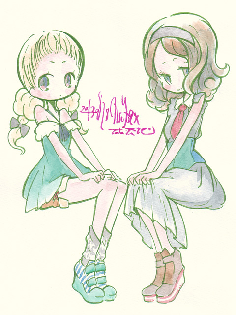 第二会場の物販ブースにダイオウイカの擬人化キャラグッズがあったので つい買ってしまった落書 女児向けステーショナリーチックなタッチが結構いい ヒディアーズとかイボルバーとかいうな 7/7 ・幻影ヲ駆ケル太陽 どっかで見た感じの絵だなあっておもったら あかつきごもくか。なんか納得 徐々にいこごちの悪い空気が張り詰め 一気に事態が動き出すのはいいんだけど 他の魔法少女(といっていいのか)が出てきたあたりで 「またこういうのか」というようなちょっと食傷感 トラックの事故やメガネっ子の存在が なかったことになってるあたりまでは なんともいこごちの悪い空気でよかったんだけどね。 ・げんしけん 二代目 あれ?声優変わってる??なんか雰囲気違う 一期は見てなかったけど二期は結構面白く見てた 次いでに二代目の原作は会社にアフタヌーンがある関係で途中から既読 面倒くさくなりそうなあたりをサクサクと 場の空気に流されるような感じで進行するので キャラの紹介をこなしつつさっくり見れるのはいいね ・神さまのいない日曜日 「人が死ななくなった世界」というのがどういうことなのか 言葉だけだとぴんと来ない設定を 後半、頭部を吹っ飛ばされた村のおじさんをだすことで 「こういうことか」と示してくれるのは親切 でも、ちゃんと頭を吹き飛ばすと動けなくなるってのはよくわからん 青年の目的が何なのか、ヒロインは何者なのか あまりしんどくならない程度に次回へ引いてくれるのはいいね ・マジでオタクなイングリッシュ!りぼんちゃん ?英語で戦う魔法少女? ネタを勢いで一気に押し流すので ギャグの当たり外れ気にする間もなく一気におわってもうた 英語成分が邪魔になってしまった「もえたん」と比べると 時間の短さもあってあまり気にならないね 一期はどこでやってたんだろって思ったらAt-Xだったのか。しらんはずだ 7/6 ・帰宅部活動日誌 「帰宅部が実際に部活動として活動している」 というところはおもしろいかなと思ったけど そこから先は…むう… 「原撮だー!!」はザブングルグラフティの 「これが動撮だ!!」を思い出させてちょっとよかったけど すでにネタ切れの様相を呈しているのはどうなんだろ ・ダンガンロンパ 超高校級の名門校でおこる密室空間のサスペンス お互いにお互いの猜疑心をあおるモノクマの目的と結末はどうなるのか 適度にいこごちの悪さと邪魔にならない程度のざっと流すキャラ紹介 元がゲームということもありシルエットで判別つきやすいキャラ造詣はありがたいところ まあ、めんどうにならなければ… ・恋愛ラボ 原作既読。個人的にはリコの 「恋愛の達人である」という誤解が晴れるあたりから 他校の男子と絡むようになってきてからのほうが面白いんだけど (原作だとすでに5人それぞれ相手がほぼ決定してきてるしね まあもともと彼氏もちが一人いるけど←校則違反) アニメだと誤解が晴れるところまでしかやらなさそうだなあ マキとリコの対比を当人同士、そして周りの評価を踏まえてやんわりと見せてくれるので キャラクター像がつかみやすいのは嬉しいところ どの辺までを組み立てていくのか楽しみ どうでもいいけど、タイム系原作アニメだと きらら系ではなく本誌系列のアニメ化って実は初めてじゃない? 7/5 ・ステラ女学院C3部 サバゲ女子なんて…なぜ今までなかったのかというぐらい どストレートなネタがきたな。 っていうか何で本当にいままでこのネタなかったんだろ 対人恐怖症の主人公が半ば強引にサバゲに引き込まれる アニメ的なお約束とはいえ制服でサバゲしてるのはどうかと思うけど テンポも丸っこい作画も悪くなく「みやすい」感じなのはいいね (でも変人変人うるさい) お嬢様学校なのに校舎がやたらファンシーなのは少しきにならんでもない(苦笑) でもほんと、もう20年以上前から「武器と少女」ネタはあるのに なんでサバゲと少女ネタのアニメがなかったんだろ 不思議不思議 ・ローゼンメイデン ヤンジャンに移籍してからのシリーズのアニメ化 旧シリーズよりもドール達が小さめに(正確に?) 作画されていてなんか可愛い しかし、旧TVシリーズ一期二期分の話を 第一話に詰め込んでるのはどうかなあ…かなり意味不明 キャラ紹介にしては完全にダイジェストというか 始めてみる人はここで脱落してしまいそうだ (ヤンジャンの最初のほうは見てないので きわめて忠実な始まり方かもしれないけど) 本編の始まる二話いこうどうなるかな そんなわけでらくがきー