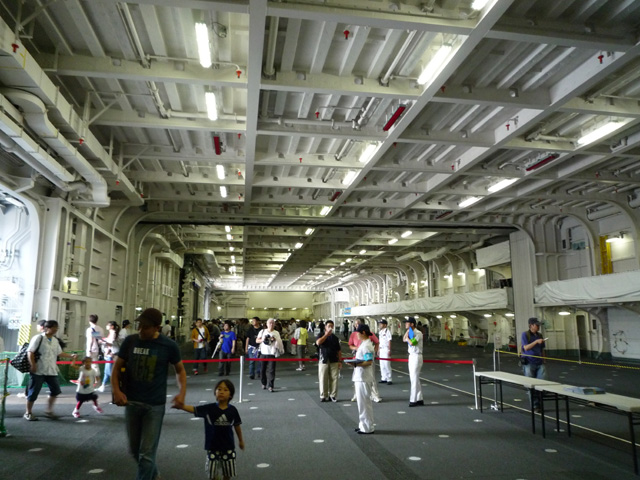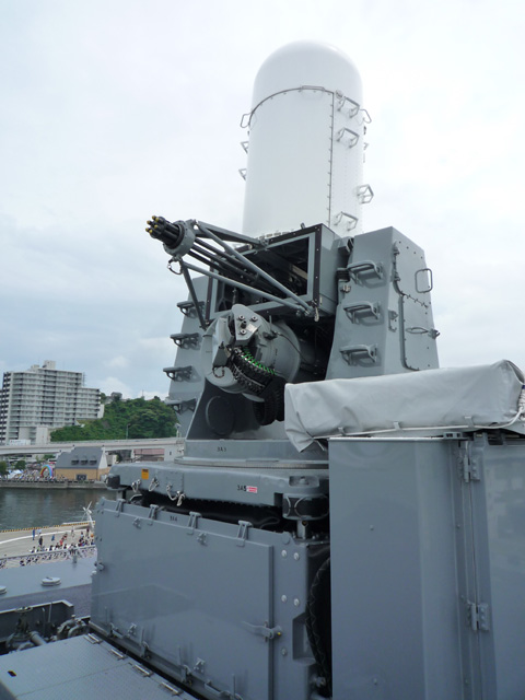 運搬用のエレベーターで甲板へ。 これが結構早い。脳内で「ワンダバ」なりっぱなし そうそう、馬の覆面した自衛艦がそこかしこで愛想振りまいていました こういう活動って自衛隊的にな任務名ってなんになるんでしょうね 広報活動の一環だとは思うけど いずもは他のヘリ護衛艦と違い武装もレーダーもすごい貧弱です 「他の護衛艦に守ってもらいながら減りをたくさん運用する」 という思想の元に設計されているので 武装と呼べるものは艦首と艦尾と艦橋の三箇所に系4門のみ。 正直割り切りすぎじゃないか