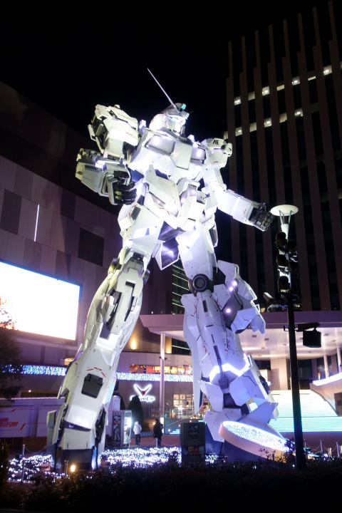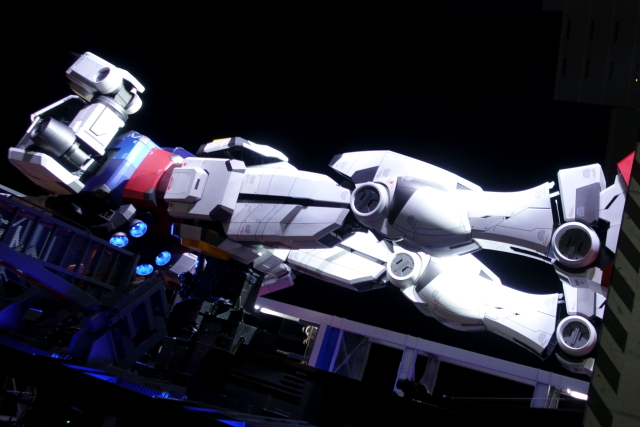 この巨体が動くというだけでNHKの生放送では感じられない迫力があるのですが 残念だったのは「足が地面に接地していない動き」なところですね まあ実際接地していないんですが あと、毎時00分に起動実験、30分に格納庫に戻る演出があるのですが 30分の格納演出は単にスライドして引っ込むだけなのが残念 後ろ向きに歩いてくのかと思ったのに そうそう、背中ですがちゃんとバーニアにも電飾が入っています