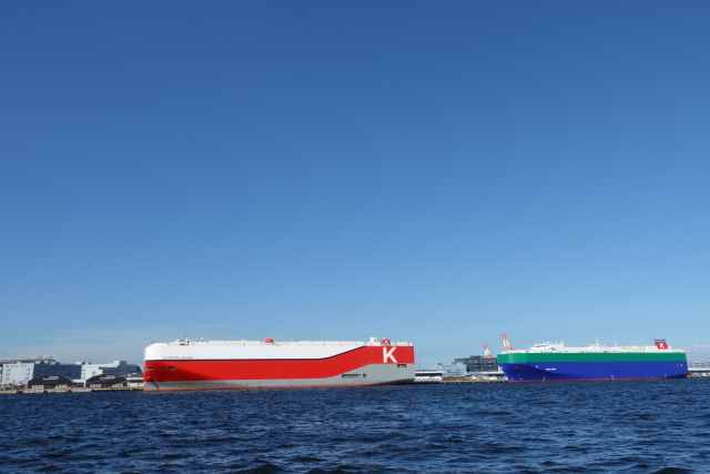 先週は一隻だった自動車運搬船が今日は二隻停泊中 左のほうに二つ並んでる黒いかまぼこ状のが大黒埠頭客船ターミナル 例のダイアモンドプリンセスが停泊していたところです