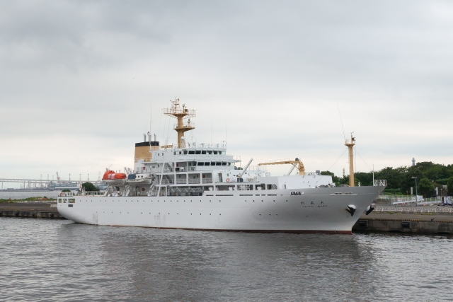 大桟橋には海底ケーブル設置するKDDIの作業船が停泊中 クレーンが超複雑でりあぱーすがすごいかっこいい
