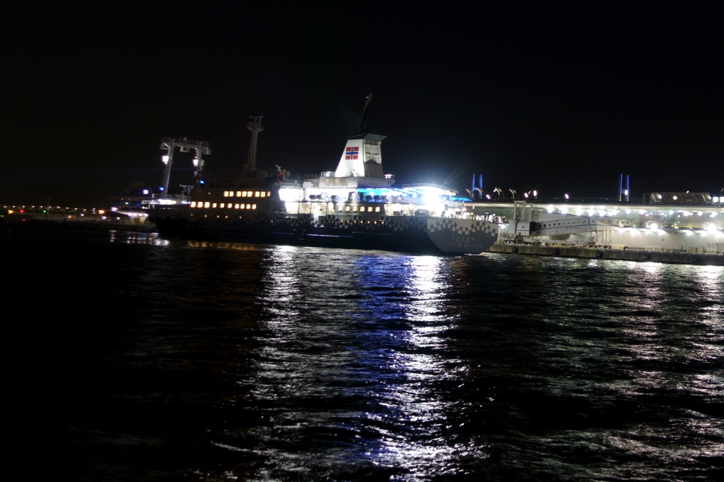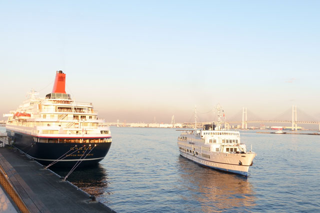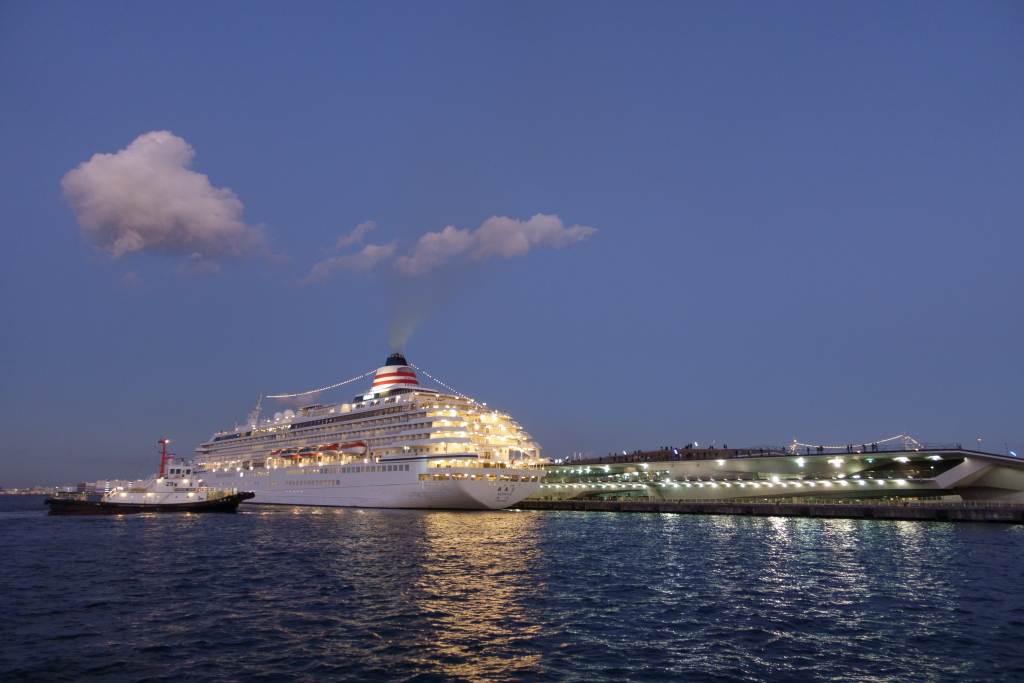 大桟橋に停泊中のにっぽん丸 奥にガンダム見えますね