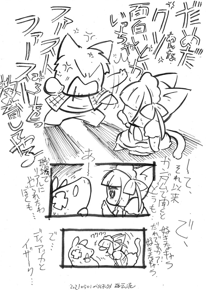 5/28 2006年に「F91以来の完全新作劇場版」として制作発表され その後うやむやになってなんか「なかったこと」になってるっぽい雰囲気になっていた (監督も「劇場版についての質問は受け付けていません」っていってたし) 劇場版ガンダムSEEDがついに制作正式決定のアナウンスが来た! 実に15年 ついにきた! ついに劇場版来た! 上海の実物大フリーダムもだけど 今年はやたら燃料投下が多いなあって思ってたけど ついに! 脚本の両澤千晶(監督の奥さん)はすでに故人ではあるけど 「脚本とデザインは出来上がっている」と 大河原邦男展の対談や過去のインタビューで答えてるので 本当にTVシリーズの続編としてのSEEDの新作ということになります 楽しみだなあ いや、公開されるまではまだ油断できない またどたんばでなかったことになるかもしれないし 5/26 ・えとたま猫客万来 6年ぶりに作られた新作 とはいえ全四話のうち三話はボイスドラマで最終話のみアニメ TVシリーズの後日談だけどモーたんが元の姿に戻ってたり にゃーたんの記憶がやっぱり全部は戻り切ってなかったりと TV本編に近い構成で干支娘達がわいわいと騒がしくにぎやかに進む物語はかなり懐かしい スサノオの封印がTVシリーズの時からちょいちょいっ見切れてたとは(笑) しかし白組のCGアニメは ピクサーのデットコピーみたいであまり気持ちよくはないなあ 良く動くしテンポものりもいいんだけどね しかしこれだったら普通に新作シリーズやってほしかったなあ 5/25 鳥獣戯画展6/20日までの延長「検討中」ですってやったー でも来月はそこそこ作業が詰まってるから有給とりづらいんだよなあ GW直後は少し手が空いてたからそこで行きたかったんだけど まあ、まだ検討中なので実際どうなることやら 一応図録だけは通販で購入しておきました 国立博物館のミュージアムショップと主催の朝日新聞の公式ページに通販出てたけど やっぱ博物館にお金落としたいからミュージアムショップのほうで (でも、主催(展覧会公式)に金落とすべきなのかなあとか思わなくもない) まあまだ今後の情勢で延長できるかどうかは変わってくると思いますが (この後の企画展もありますしね) 来月は都内でアイヌ関連の展示もあるから これ以上面倒なことは起きないでほしいなあ 5/23 いつものー 前から気になってた水筆買ってみたんだけど 水の量の調整案外難しいな