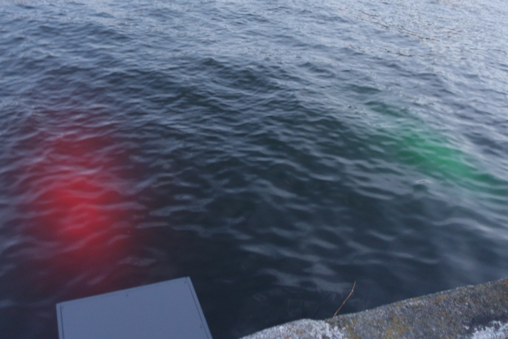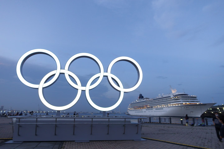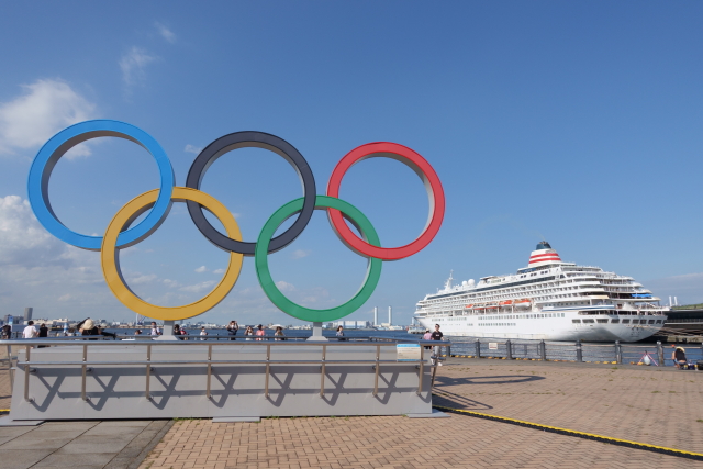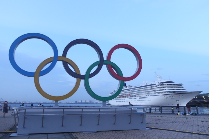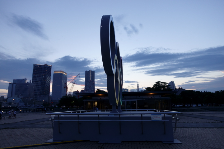 ちょっと目立ちにくい場所ですが海には五輪カラーが投影されてます