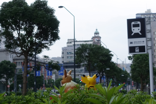 パノラマ撮影もうちょっと幅ほしいなあ。手前に対象物ないとちゃんと処理されないし 後横浜市役所前のピカチュウとイーブイポスト