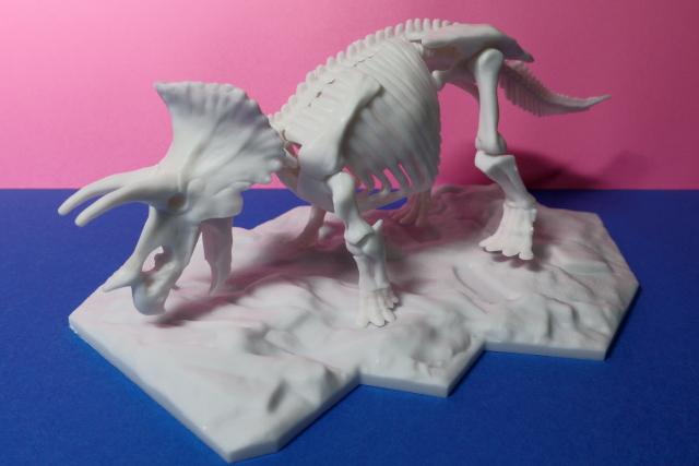モノとしては一時期話題になった学年誌付録のプラモと同じらしいのですが 石灰と樹脂による新素材LIMEXを使ってるのが特徴 説明書にもある通り、触れただけで分かる「素材のもろさ」は しっとりとした表面のマットさも相まってなかなか面白い効果 個人的にはベースのカッティングの角度によって 複数の組み合わせが楽しめるという仕掛けが興味深い まあ、僕トリケラトプスしか買ってないから組み合わせれないんだけどね 10/24 いつもの