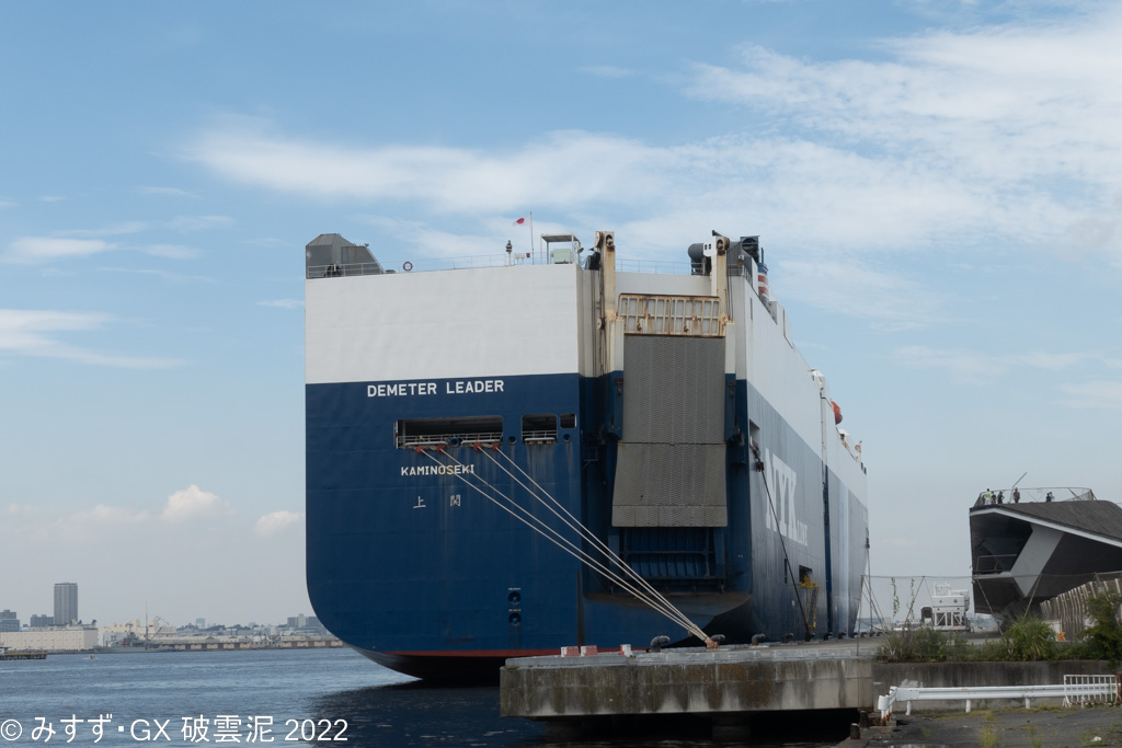 ちなみに屋内の施設見学はやはり訓練用の水深10mの水槽とかやばかったですね むちゃくちゃ怖い あとオイルフェンス。機材も含めてこんなに種類があるんだと 家族連れとか多く、艦橋とかかなり混雑してる個所もあったので あまり長いせずほぼ素通りに近い感じだったのでかなりもったいない まあまた公開日に来ればいいか で、お目当ての珍しい船 自動車運搬船です。輸出とかに使う車用のタンカーですね なんで大桟橋に??って思ったらなんかのイベントで停泊してたらしい