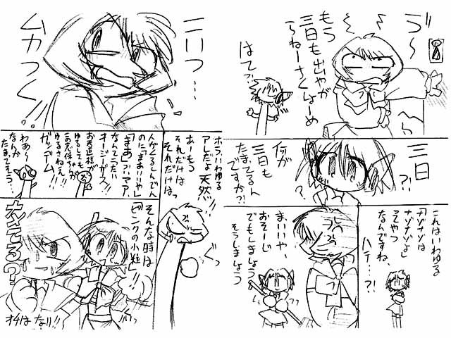 rmはどうなるの(2005年冬)ピンキー本第5弾。でも、本格的にピンキーと関係なくなってきた(苦笑) お汁粉薀蓄で行くか、美味しそうにお汁粉を食べてる漫画にするか 簡単なお汁粉の作り方にするか 最後まで悩んでしまった挙句に一寸中途半端になってしまったのは失敗 裏表紙の「邪道喰い」は当初漫画のオチにする予定でした。 でも、あれだと「邪道喰い」というよりも「悪食三兄弟」オチだよね。 漫画ではさっちんを弄りすぎたので、レイナは元に近く描いたのですが だんだん断り書きを入れないと誰がなんなんだかわからなくなってきたなあ… 次回はもう一寸pinky:stっぽくします。気が向いたらね