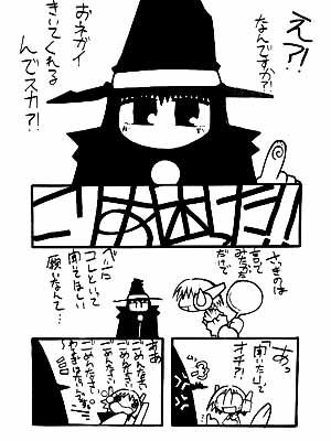 「脳天気魔法図鑑2」(9?年) 「赤ずきんチャチャ」第二段。前作と違いかなり雑多。なんと言っても見所は 下書き無しの3mmペン一発描きと言う暴挙。何が描いてあるかわからん 「綿帽子綿帽リーヤになあれ」 「綿帽子綿帽子しいねちゃんになあれ」 で、「ニーヤ」と「椎名君」が出てくるカメレオンネタは前作の再録(一部書き直し) 裏表紙は「魔王」ネタ。オニキュ〜