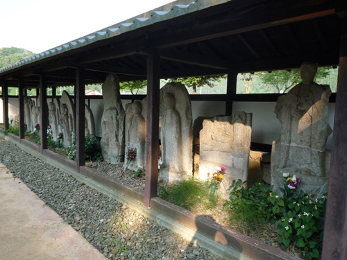 などと思いつつ着た道を戻って盛源寺に到着 正面の適当な空き地に車を止め、お寺への坂道へと入っていくと その脇には無造作に並べられた石仏達
