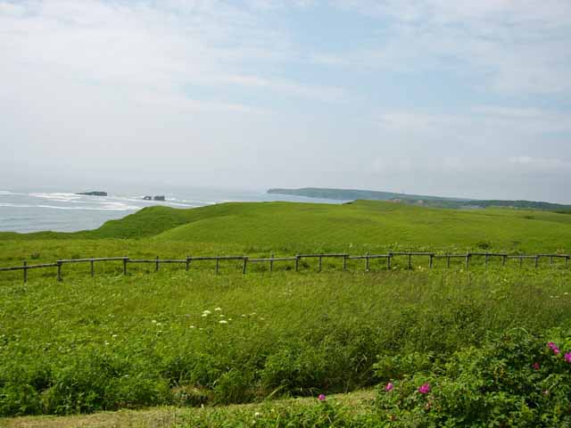 このあたり一帯、もこっもこっって盛り上がった岩盤が海岸線に連なっていて、 琵琶瀬展望台もそういった岩の上のようです。 周りは放牧地になっているらしく馬が一杯だれていました