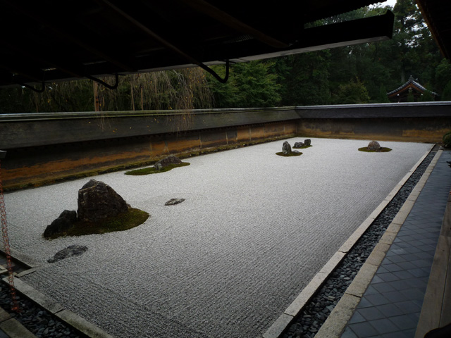 石は15個あるのにいっぺんに15個見えないとか 庭を区切る壁に変なパースがついてるので奥行きがゆがんで見えるとか いろいろ言われる石庭ですが これ、凄い悪戯好きの人が設計したんじゃないかな